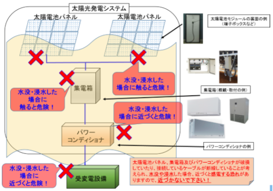 漂流物などにより、太陽電池パネル、集電箱及びパワーコンディショナが破損したり、接続している電線が切れたりしている場合は、水没・浸水時に近づくと感電する恐れがありますので、近づかないようにしてください。